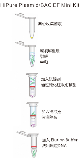 本试剂盒采用玻纤滤膜纯化技术,只需进行简单的结合-洗涤-洗脱的步骤。细菌经离心收集后,首先用碱裂法进行裂解中和,并通过离心去除蛋白质和基因组;上清液再经过纯化柱中进行离心或抽滤,质粒DNA吸附在玻纤膜上;杂质经过两次清洗被去除,最后用少量洗脱液或水洗脱出纯化的DNA。 |