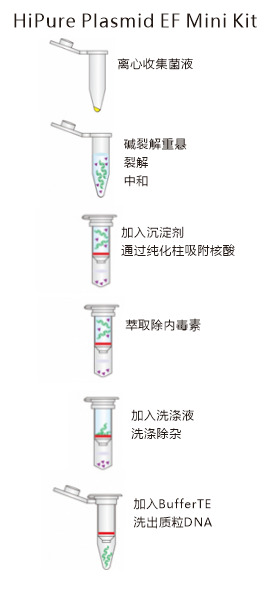 本试剂盒采用玻纤滤膜纯化技术,只需进行简单的结合-洗涤-洗脱的步骤。细菌经离心收集后,首先用碱裂法进行裂解中和,并通过离心去除蛋白质和基因组;然后将澄清的裂解物加至纯化柱中进行离心或抽滤,质粒DNA吸附在玻纤膜上;杂质经过两次清洗被去除,最后用少量洗脱液或水洗脱出纯化的DNA。 |