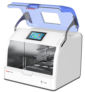Magmix 96全自动高通量核酸提取仪采用磁棒拍打和转移方式,使待检样本在合适的条件下自动进行裂解、核酸与磁珠结合、磁珠转移和分离、 洗脱释放,从而实现从样本中分离提纯核酸。与其他提取方法相比,Magmix系列全自动核酸提取仪配套预分装试剂操作更为简便快捷,可实现全自动化核酸提取。该仪器可同时进行1-96个样本的提取,用户只需通过触摸屏的简单操作就可实现实验程序编辑、实验状态监控、开关紫外 灯消毒等功能,具有操作简便、提取快速、结果可靠的特点 Magmix 96核酸提取仪采用96孔深孔板和96磁套作为提取耗材,深孔板底部和加热模块充分接触,大大提高孔间的温度均匀性,从而减少了提取造成的孔间差异。 Magmix 96核酸提取仪配合相应的磁珠法核酸提取试剂,可以快速提取动植物组织、血液、体液、食品、病原微 生物等样品中的DNA和RNA。提取仪用于生物样本的核酸提取纯化,适用于临床检测、常规科研、基因组学分 析、疾控系统、食品安全检验、法医鉴定等领域。 |