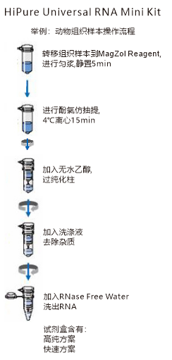 HiPure Unviersal RNA Kits将经典的一步法RNA抽提试剂和硅胶柱纯化方式相结合,可大大提高RNA的纯度和样品的广泛性。纯化RNA可直接用于RT-PCR,芯片分析,第二代测序,cDNA文库构建等运用。组织/细胞样品经一步法RNA抽提试剂(MagZol Reagent)匀浆,加入氯仿抽提去除基因组DNA和蛋白质,得到的上清液与乙醇混匀后,转移至RNA柱子中进一步纯化RNA,经洗涤液去除杂质和盐分,最后用DEPC水洗脱出高纯度的RNA。HiPure Unviersal RNA Mini Kit适合于从小于100mg动物组织,植物组织,真菌样品,细菌,细胞等样品中提取高达200ug的总RNA。 |