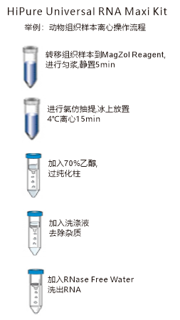 HiPure Unviersal RNA Kits将经典的一步法RNA抽提试剂和硅胶柱纯化方式相结合,可大大提高RNA的纯度和样品的广泛性。纯化RNA可直接用于RT-PCR,芯片分析,第二代测序,cDNA文库构建等运用。组织/细胞样品经一步法RNA抽提试剂(MagZol Reagent)匀浆,加入氯仿抽提去除基因组DNA和蛋白质,得到的上清液与乙醇混匀后,转移至RNA柱子中进一步纯化RNA,经洗涤液去除杂质和盐分,最后用DEPC水洗脱出高纯度的RNA。HiPure Unviersal RNA Maxi Kit适合于从小于1g动物组织,植物组织,真菌样品,细菌,细胞等样品中提取高达5mg的总RNA。