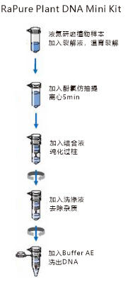 本试剂盒采用玻纤滤膜纯化技术,只需进行简单的结合-洗涤-洗脱的步骤。植物样品经物理方法研磨成粉未,加到含SDS和RNA酶试剂进行加温裂解,裂解液经高盐盐析沉淀多糖和蛋白质,离心得到澄清的裂解物,加入结合液调整最佳的结合条件后转移至纯化柱中并离心,DNA被选择性地结合到滤膜,而蛋白质等杂质由滤出到滤液中。经过两个洗涤步骤除去了残留的污染物和酶抑制剂,最后DNA被少量的水或缓冲液洗脱出来。 |